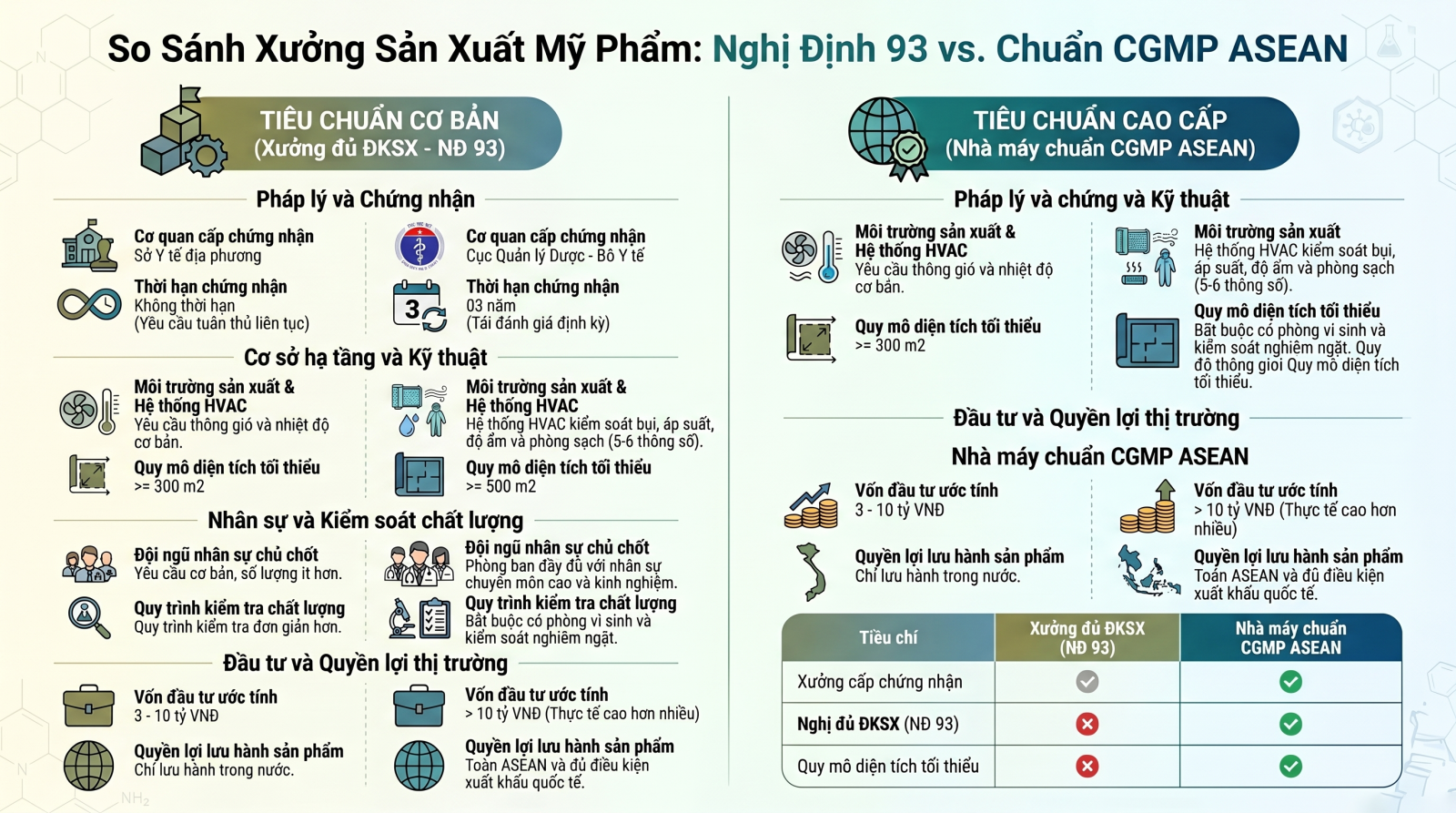So sánh chi tiết Xưởng đủ điều kiện (NĐ 93) và Nhà máy CGMP ASEAN