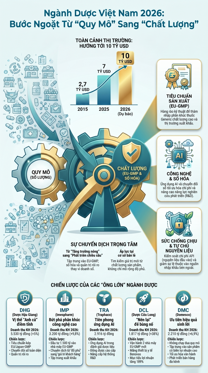 Bước sang năm 2026, thị trường dược phẩm Việt Nam không chỉ chứng kiến sự bùng nổ về quy mô mà còn đánh dấu một bước ngoặt quan trọng trong tư duy quản trị. Thay vì chạy theo tăng trưởng nóng bằng mọi giá, các doanh nghiệp đầu ngành đang chuyển mình mạnh mẽ sang mô hình phát triển chiều sâu, lấy tiêu chuẩn chất lượng quốc tế và năng lực số hóa làm "hàng rào" cạnh tranh.