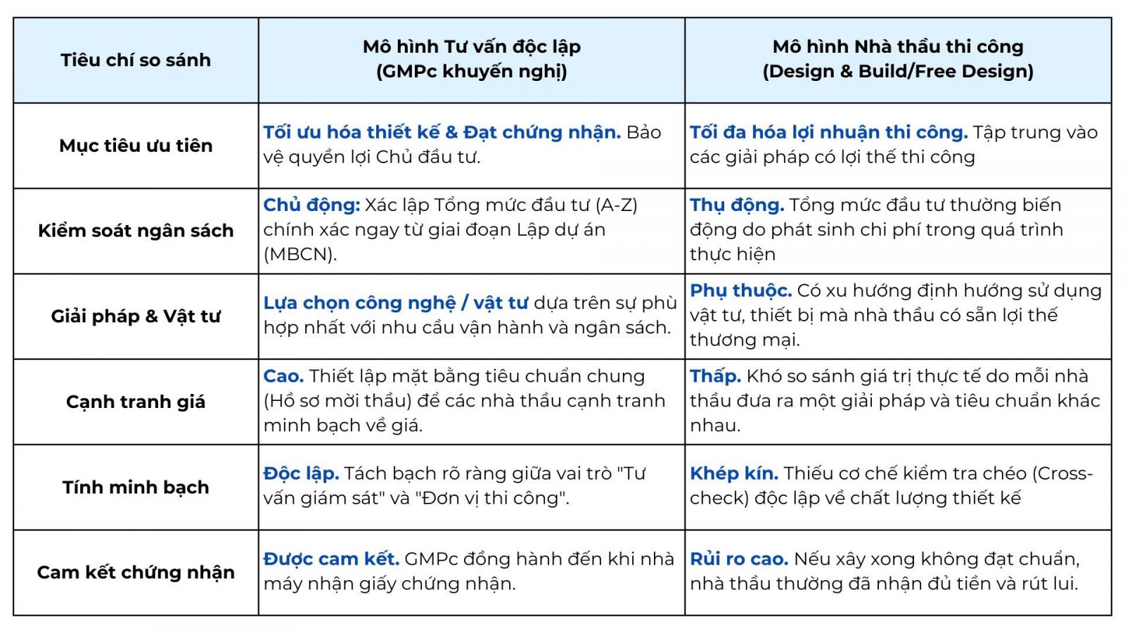 BẢNG SO SÁNH: MÔ HÌNH TƯ VẤN GMPc vs. NHÀ THẦU THI CÔNG KIÊM THIẾT KẾ