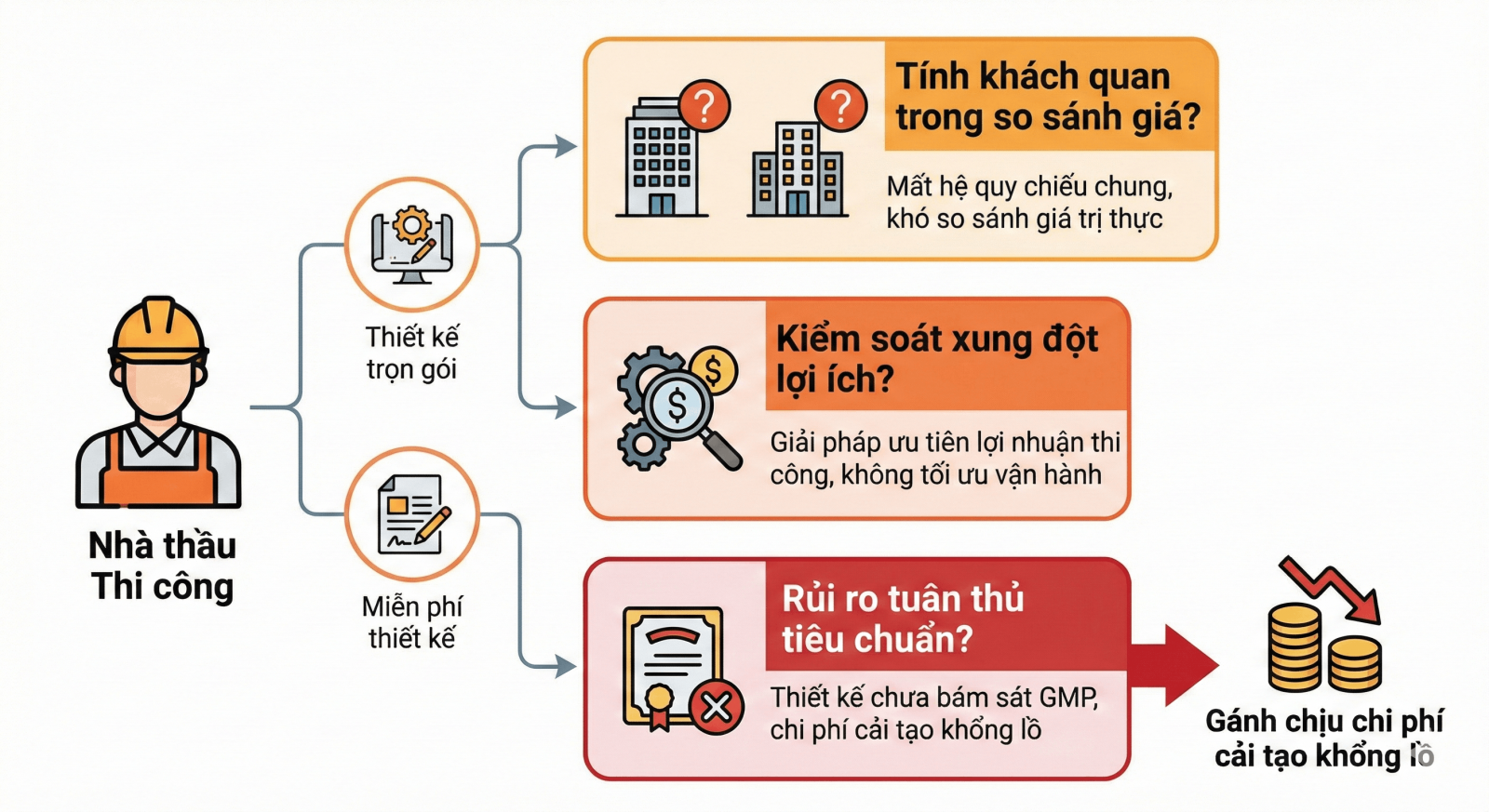 • Tính khách quan trong so sánh giá: Khi đơn vị thi công kiêm nhiệm thiết kế, mỗi nhà thầu sẽ đưa ra một giải pháp kỹ thuật và danh mục vật tư khác nhau. Điều này khiến Chủ đầu tư mất đi hệ quy chiếu chung để so sánh giá trị thực tế của các gói thầu, dẫn đến khó khăn trong việc đánh giá mức độ hợp lý của chi phí.